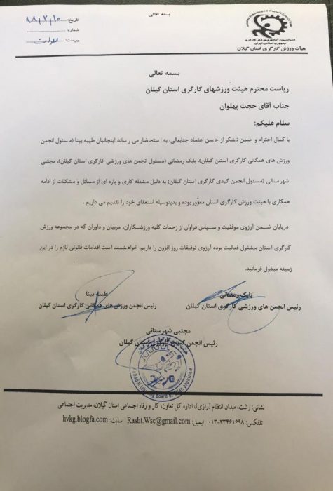 گفتنی است که هفته گذشته محمد تطهیری دبیر هیات ورزش های کارگری استان گیلان نیز از سمت خود استعفا داده بود.
