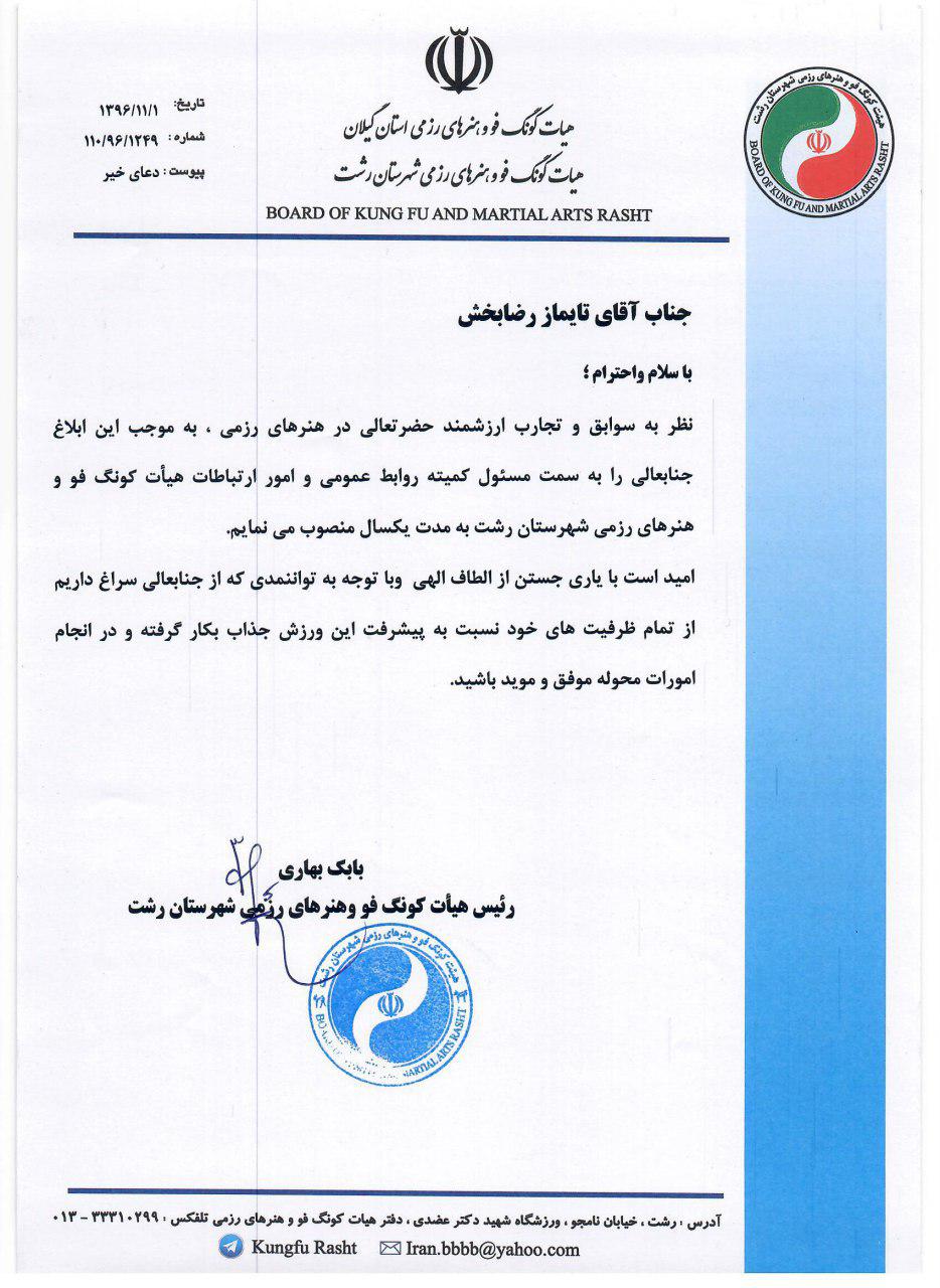 true 01 بهمن 1396 true true تایماز رضابخش مسئول کمیته روابط عمومی و امور ارتباطات هیات کونگ فوی شهرستان رشت شد با حکمی از سوی رئیس هیات کونگ فو و هنرهای رزمی شهرستان رشت، تایماز رضابخش به عنوان مسئول کمیته روابط عمومی و امور ارتباطات این هیات انتخاب شد. true با حکمی از سوی رئیس هیات کونگ فو و هنرهای رزمی شهرستان رشت، تایماز رضابخش به عنوان مسئول کمیته روابط عمومی و امور ارتباطات این هیات انتخاب شد. true caspinews true کد خبر 85054 false true بدون نظر true پرینت لینک کوتاه https://shoaemashregh.ir/?p=85054 true موضوعات اخبار اصلی true برچسب ها این مطلب بدون برچسب می باشد. true مطلب قبل و بعد توضیحات اداره کل فرهنگ و ارشاد اسلامی استان گیلان درباره خبر با عنوان “انتخابات هیات مدیره وجاهت قانونی ندارد” » « تشییع پیکر تکاور شهید «بیژن زارع» در انزلی true مطالب مشابه اهمیت مدیریت فرهنگی در جامعه تا چه اندازه است؟ این طرح صفوف اغتشاشگر از معترض را جدا خواهد کرد/ پس از حوادث اخیر مجلس تشخیص داد باید با سرعت رسیدگی کند نحوه دهکبندی برای پرداخت یارانه نقدی تغییر کرد/ شارژ کالابرگ سال آینده ادامه دارد؟/ جزئیات آقایان مسئول! زمانی که این تروریستها داشتند برای حوادث اخیر مسلح می شدند کجا بودید؟/ مگر نمی گفتید اگر چه فقر هست، امنیت داریم؟ بدون دیدگاه شما هم می توانید دیدگاه خود را ثبت کنید کامل کردن گزینه های ستاره دار (*) الزامی است - آدرس پست الکترونیکی شما محفوظ بوده و نمایش داده نخواهد شد - برای صرفنظر کردن از پاسخگویی اینجا را کلیک نمایید. Δ